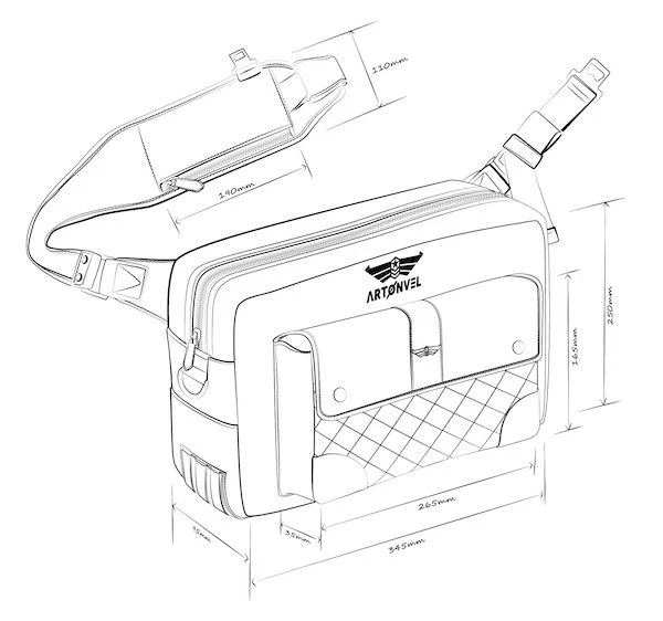 De Aviator Messenger tas heeft een inhoud van 7 liter en een waterdichte liner zodat je een 13-inch laptop mee kan nemen op je motor.Uitgerust met een schouderriem opbergvak met ritsluiting, dit is de ideale plek om je telefoon, rijbewijs of betaalpas te bewaren.De Aviator messenger tas zit schuin op de rug en heeft een afneembare heupband die zorgt voor extra ondersteuning. Als je de heupband los maakt kan de tas door een simpele rotatie onder de rechterarm naar de voorkant van je lichaam gedraaid worden. De tas bevindt zich dan in een rechtopstaande positie, ideaal voor gemakkelijke toegang tot de verschillende compartimenten.De Artonvel Aviator messengerbag is gemaakt van hoogwaardige, duurzame en waterdichte materialen voor dagelijks gebruik en onder alle omstandigheden.Vintage volnerf rundleer en suèdeIntern en extern gevoerd compartiment voor tablet of laptop tot 13 inchExtra vak geïntegreerd in de riem voor het opbergen van een smartphone, creditcard, enz.Externe metalen ring om een sleutelbos, een accessoire enz. op te hangen.Ritsen met YKK-schuifregelaarsBevestigingsriem voor een goede pasvormFlessenopener geïntegreerd in de sluitgespAfmetingen zak: breedte 345 mm – hoogte 250 mm – dikte 95 mm