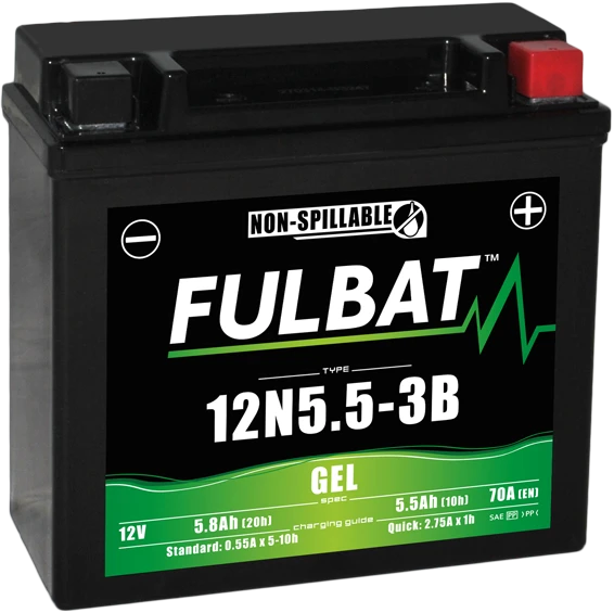 De Fulbat 12N5.5-3B GEL motor accu is onderhoudsvrij. Heeft een spanning van 12V, een capaciteit van 5.5 Ah (10h) en een startcapaciteit van 55Â A (CCA). De 12N5.5-3B GEL is tot 90 graden kantelbaar. De afmetingen zijn 135 mm lang, bij 60Â mm breed en 130 mm hoog.